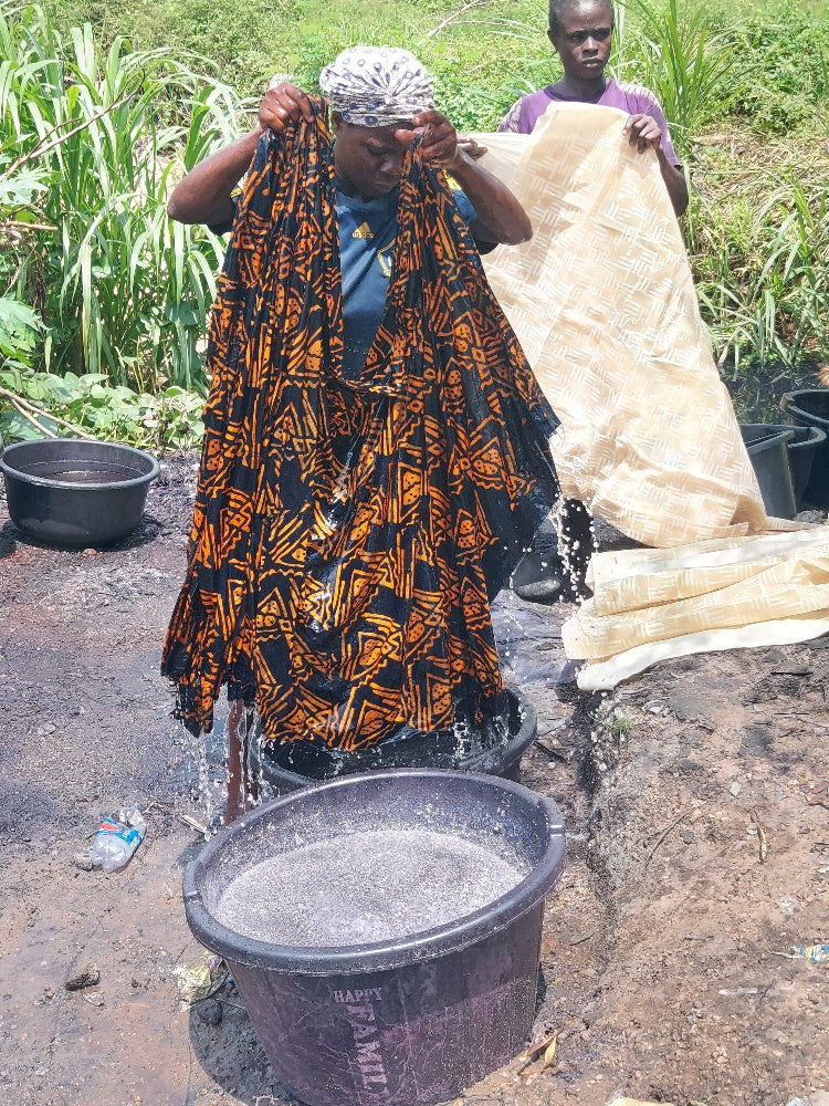 A special solution, comprising dye color, sulphite, soda, and boiling water, is meticulously prepared. The fabric is then immersed in this solution, allowing the vibrant hues to seep into the untreated areas while the tied sections preserve their original color. After soaking, the fabric is rinsed, revealing the beautifully crafted patterns as the twine is removed.